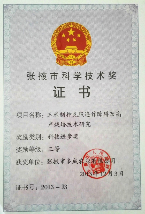 玉米制種克服連作障礙及高產(chǎn)栽培技術研究市科學技術獎三等獎
