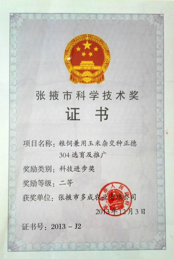 糧飼兼用玉米雜交種正德304選育及推廣——張掖市科學(xué)技術(shù)進(jìn)步獎(jiǎng)二等獎(jiǎng) | ||